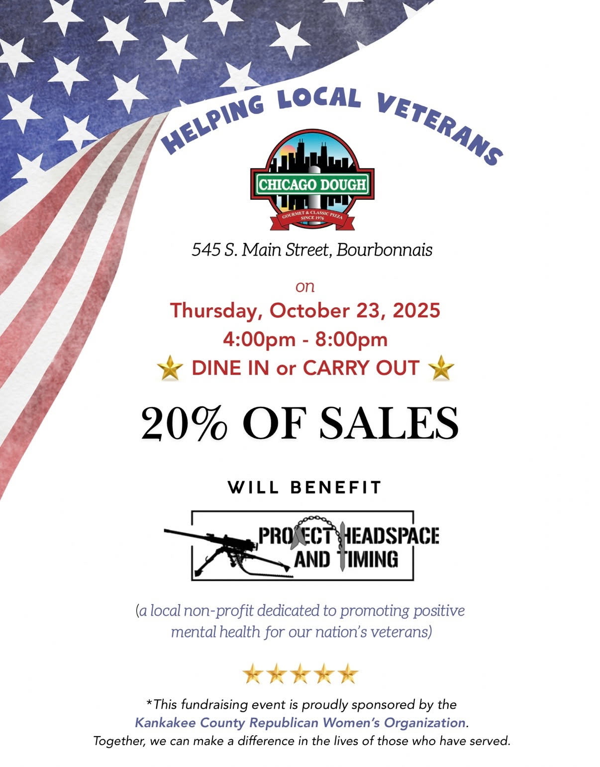 Chicago Dough - Bourbonnais 545 S. Main St, BourbonnaisJoin Kankakee County Republican Women Dine to Donate - Help Local Veterans Thursday, October 23rd 4PM - 8PM Chicago Dough 545 S. Main St, Bourbonnais, IL 60914 Dine in or Carry Out 20% of Sales will benefit: Protect Headspace and Timing (A local non-profit dedicated to promoting positive mental health for our nation's veterans) *This […]